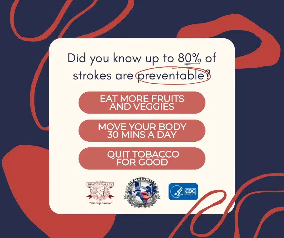 Each year, strokes impact nearly 800,000 people in the U.S. but the good news is, up to 80% of strokes are preventable with the right lifestyle choices. At BVRAC, we’re committed to strengthening the emergency care system across the Brazos Valley—and that includes empowering our community to take proactive steps toward better health.