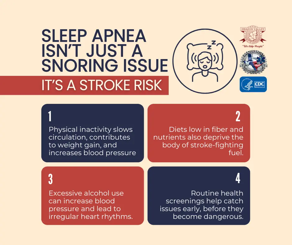 Obstructive sleep apnea, where breathing repeatedly stops and starts during sleep, doesn’t just disrupt rest. It’s also associated with high blood pressure, heart problems, and an increased risk of stroke. The Mayo Clinic notes that untreated sleep apnea can result in sudden drops in blood oxygen, straining the cardiovascular system and contributing to potentially life-threatening conditions like stroke Mayo Clinic, 2024.